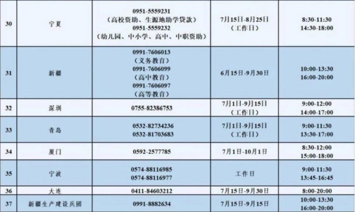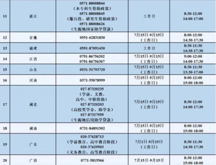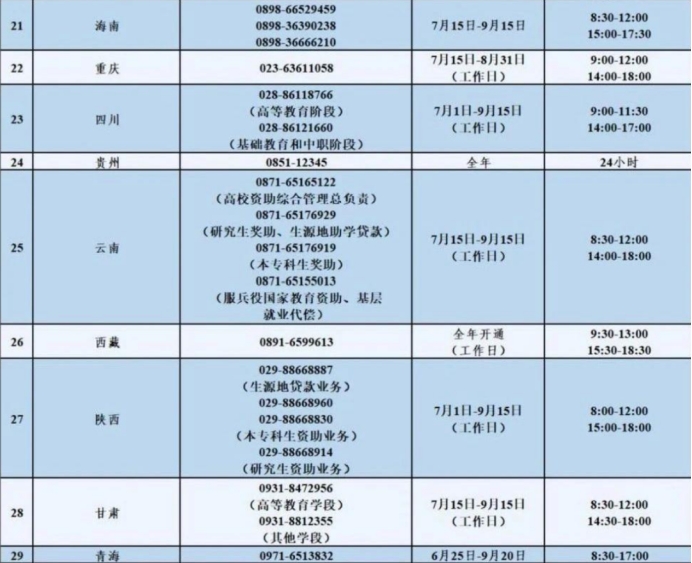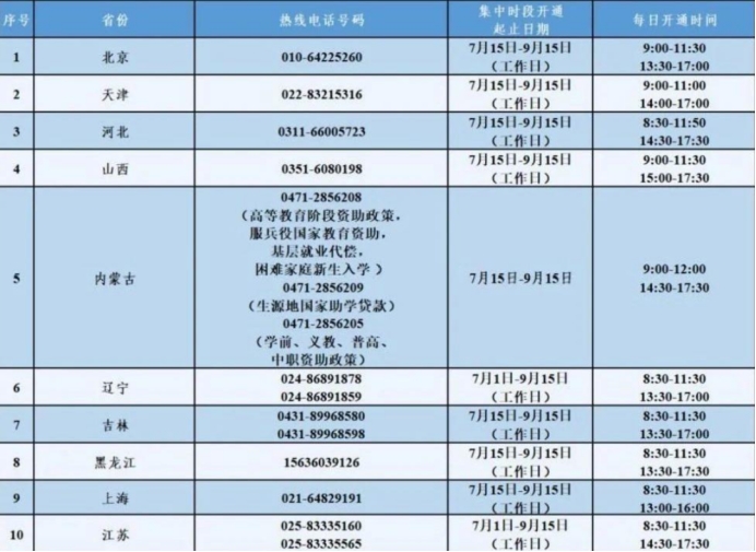 附:2025年暑期省级学生资助热线电话一览表